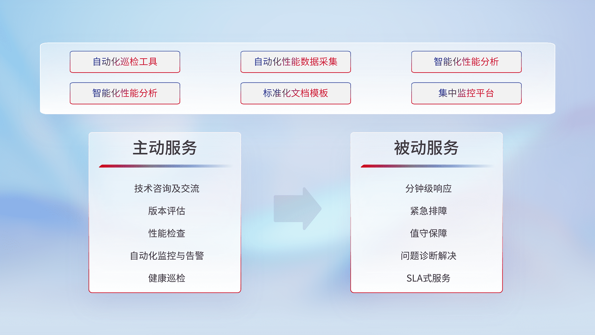 智能化工具和标准化文档,,保障服务质量,,,,提供主动服务(包含技术咨询、、版本评估、、性能检查、、、自动化监控与告警、、、、健康巡检)和被动服务包含(分钟级响应、、紧急排障、、值守保障、、问题诊断解决、、、、SLA服务)。。